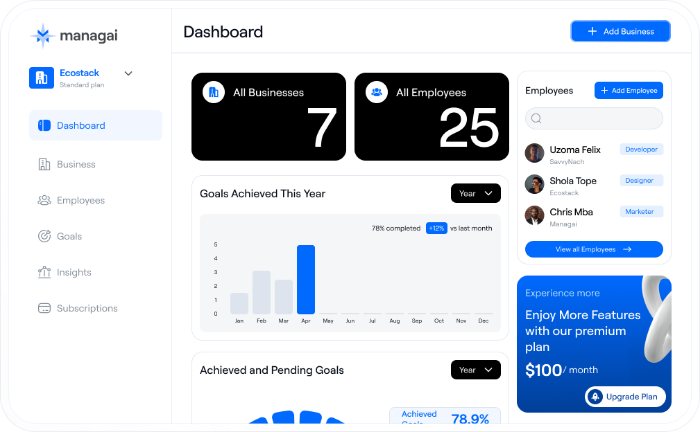 ManagAI sets automated weekly goals for your business, tracks team performance, and drives growth with AI-powered insights.